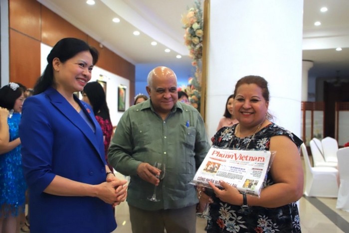 Ủy viên TƯ Đảng, Chủ tịch Hội LHPN Việt Nam Hà Thị Nga tặng báo Phụ nữ Việt Nam cho Uỷ viên Bộ Chính trị, Tổng thư ký Hội LHPN Cuba Teresa Amarelle