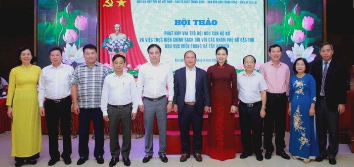 Các đại biểu tham dự Hội thảo "Phát huy vai trò đội ngũ cán bộ nữ và việc thực hiện chính sách đối với các nhóm phụ nữ đặc thù" khu vực miền Trung và Tây Nguyên, diễn ra ngày 13/9/2023 tại tỉnh Gia Lai