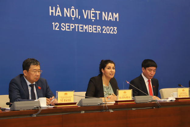 Giám đốc Chương trình Nghị sĩ trẻ Liên minh Nghị viện thế giới IPU Zena Hial (giữa) phát biểu tại buổi họp báo