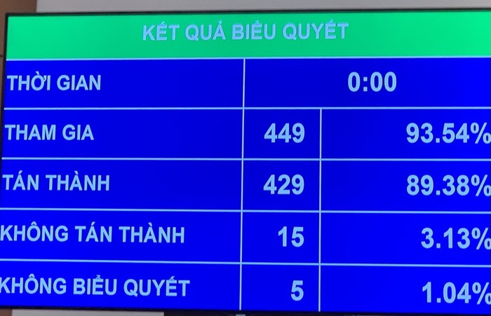 Tỷ lệ biểu quyết có 429 ĐBQH trong tổng số 449 ĐBQH tham dự tán thành (chiếm 89,38% tổng số ĐBQH). Có 15 ĐBQH không tán thành (chiếm 3,13% tổng số ĐBQH). 5 ĐBQH không tham gia biểu quyết (chiếm 1,04% tổng số ĐBQH).