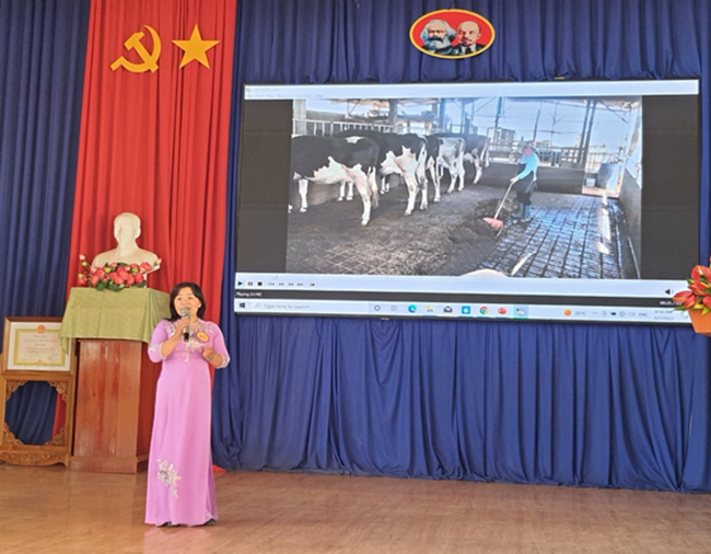 Chị Đặng Thị Kim Hồng, Hội LHPN xã Đạ Ròn trình bày ý tưởng “Phát triển mô hình trang trại chăn nuôi bò sữa”