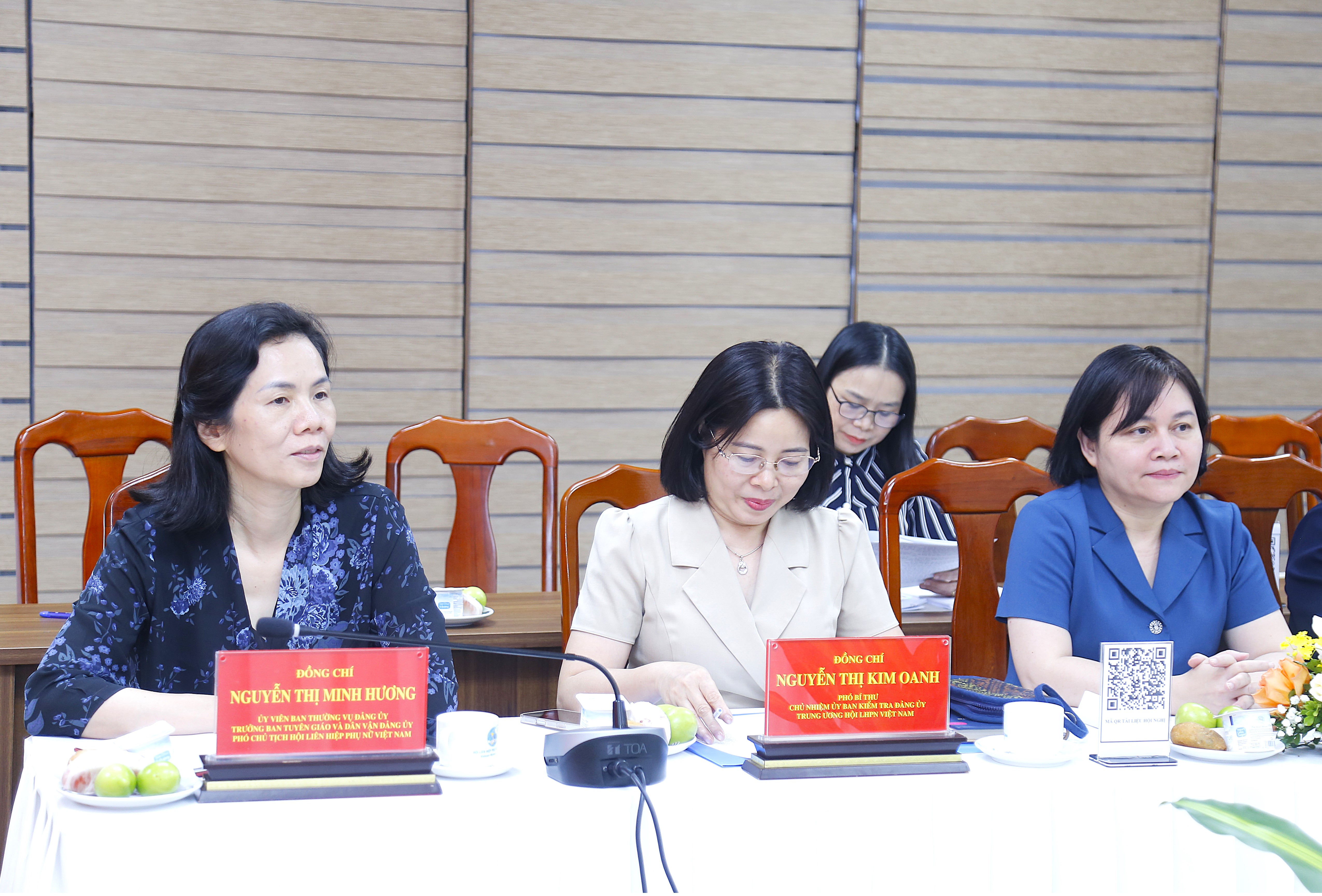 Phó Chủ tịch Hội LHPN Việt Nam Nguyễn Thị Minh Hương (trái ảnh); Phó Bí thư Đảng ủy TW Hội LHPN Việt Nam Nguyễn Thị Kim Oanh (giữa ảnh) tham dự hội nghị