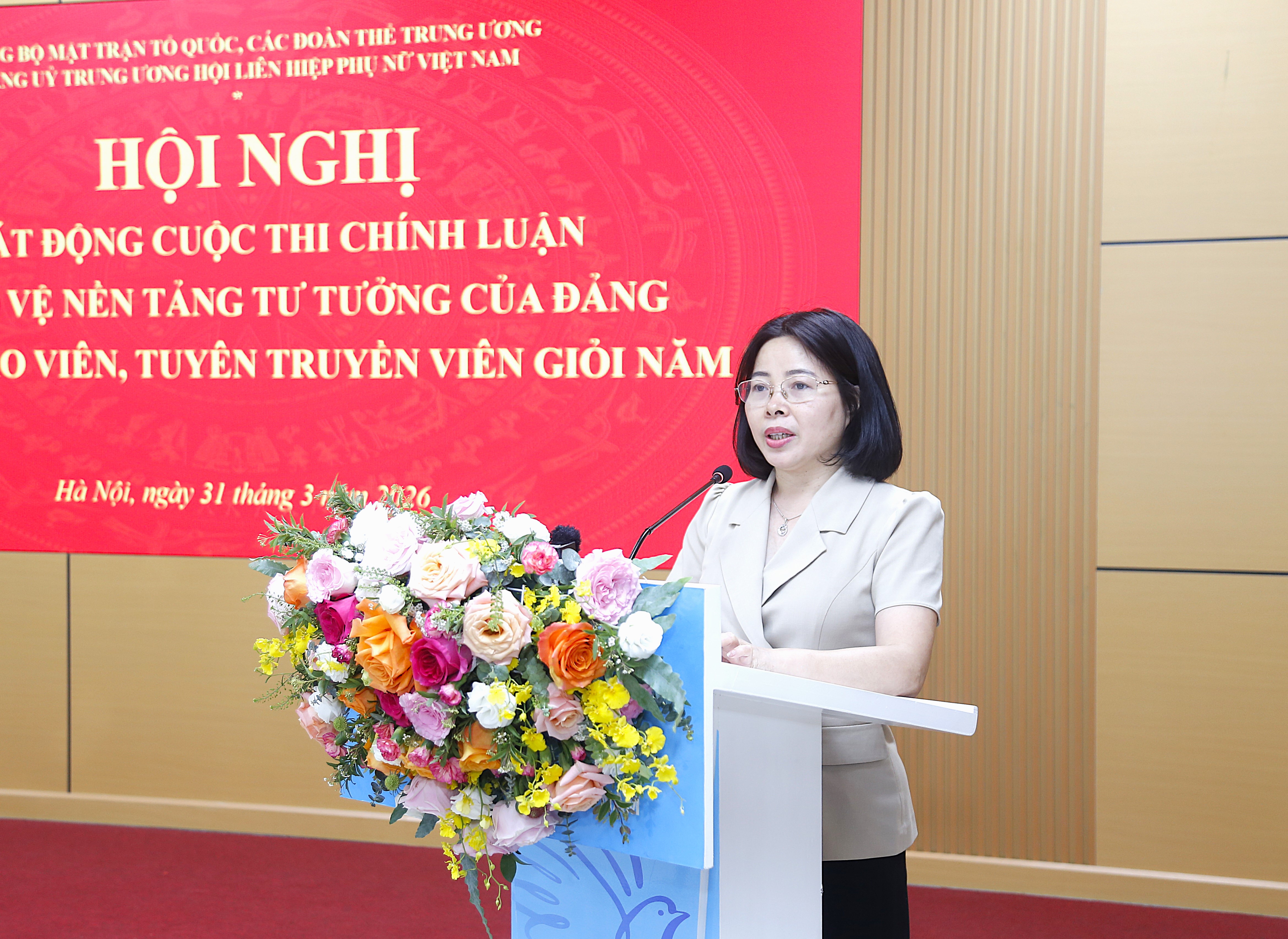 “Với mục tiêu tiếp tục nâng cao nhận thức, trách nhiệm của các cấp ủy, tổ chức đảng, của cán bộ, đảng viên và các tầng lớp nhân dân đối với nhiệm vụ bảo vệ nền tảng tư tưởng của Đảng; đồng thời phát hiện, bồi dưỡng và huy động lực lượng tham gia đấu tranh phản bác các quan điểm sai trái, thù địch trong tình hình mới; thay mặt Ban Thường vụ Đảng ủy, tôi phát động toàn thể cán bộ, đảng viên, đoàn viên, thanh niên trong toàn TW Hội tham gia Cuộc thi chính luận về bảo vệ nền tảng tư tưởng của Đảng lần thứ Hai, năm 2026 của Đảng ủy MTTQ, các đoàn thể TW với chủ đề “Phát huy vai trò của Mặt trận Tổ quốc Việt Nam, các tổ chức chính trị - xã hội, hội quần chúng do Đảng, Nhà nước giao nhiệm vụ tham gia bảo vệ nền tảng tư tưởng của Đảng trong kỷ nguyên phát triển mới””, Phó Bí thư Đảng ủy TW Hội LHPN Việt Nam Nguyễn Thị Kim Oanh phát động.