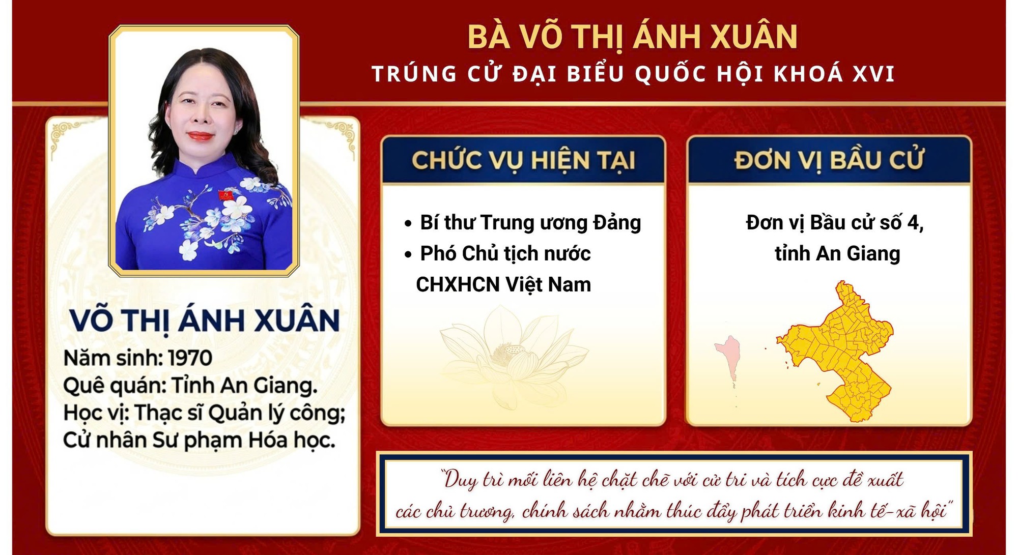 Bà Võ Thị Ánh Xuân sinh năm 1970, có quá trình công tác dày dạn, kinh qua nhiều vị trí lãnh đạo quan trọng từ địa phương đến Trung ương. Việc bà tiếp tục trúng cử Đại biểu Quốc hội khóa XVI tại tỉnh An Giang không chỉ là vinh dự cá nhân mà còn cho thấy sự gắn kết chặt chẽ giữa bà và cử tri nơi vùng đất biên giới Tây Nam bộ.