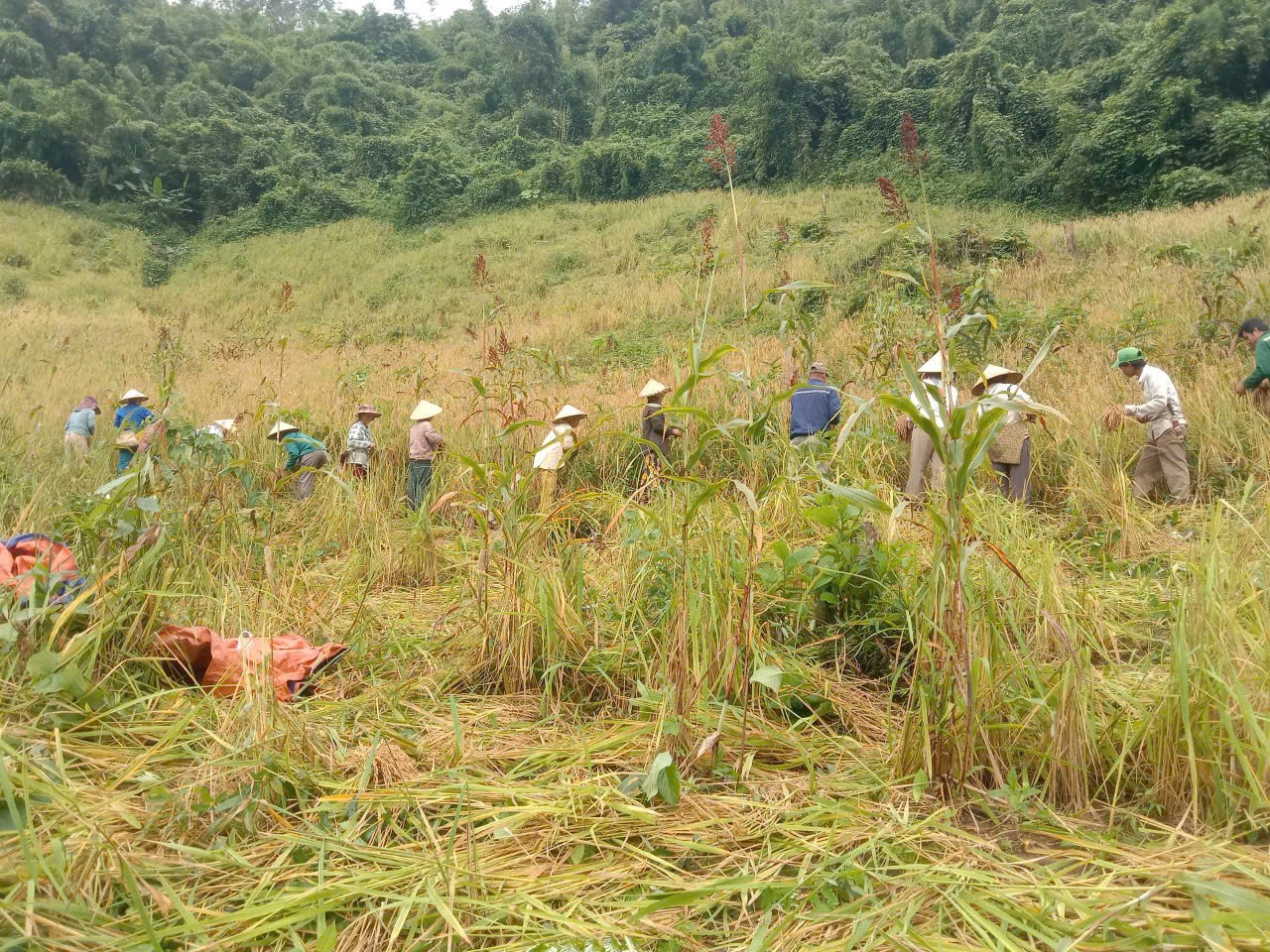 Chị em phụ nữ gặt lúa giúp hội viên tốm đau tại Chi hội Minh Thành, xã Lượng Minh