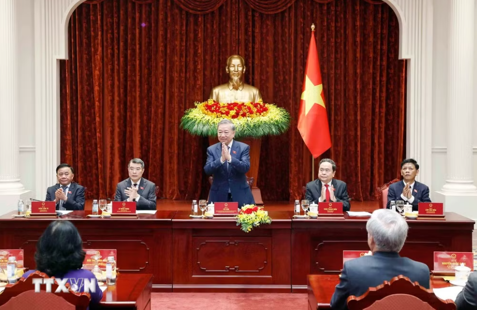 Tổng Bí thư, Chủ tịch nước Tô Lâm và các đồng chí lãnh đạo Đảng, Nhà nước tại buổi gặp mặt. (Ảnh: Thống Nhất/TTXVN)
