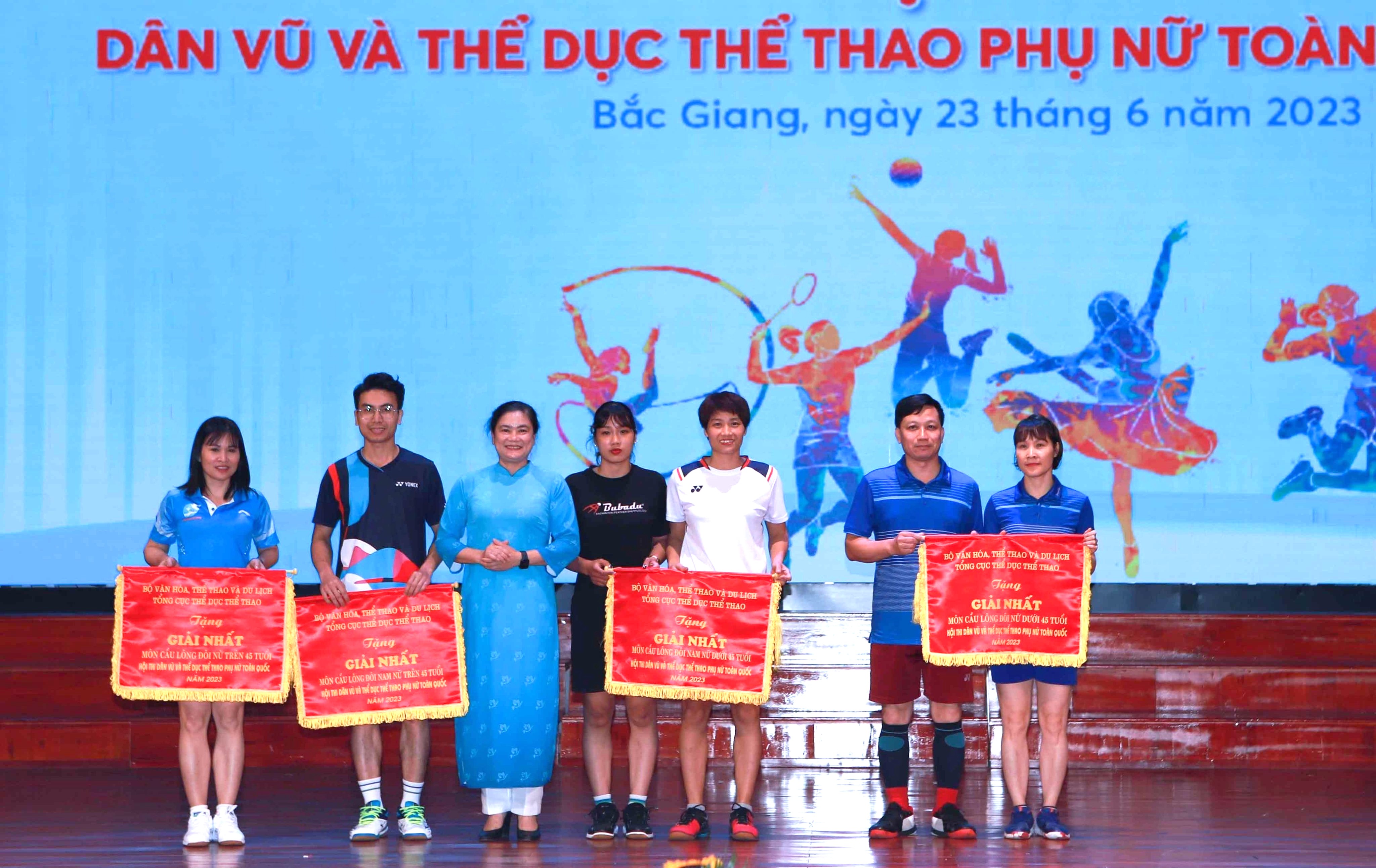 Phó Chủ tịch Thường trực Hội LHPN Việt Nam Đỗ Thị Thu Thảo trao 4 Giải Nhất môn Cầu lông II. Môn Dân vũ: - Giải chuyên đề: 11 đội + Quảng bá hình ảnh quê hương đất nước Việt Nam ấn tượng: Cà Mau - Điện Biên + Phong cách trình diễn ấn tượng: Đồng Nai – Hải Dương – Tuyên Quang + Giải Biểu diễn bài dân vũ mẫu ấn tượng: Sơn La – Đà Nẵng + Giải Biểu diễn bài dân vũ tự chọn ấn tượng: Ninh Bình – Kon Tum + Giải Trang phục ấn tượng: Cao Bằng, Bình Phước + Đội được bình chọn nhiều nhất tại vòng Sơ khảo Hội thi: Hậu Giang - Giải khuyến khích (5 đội): Phú Thọ, Quảng Ninh, Lào Cai, Lâm Đồng, Hà Tĩnh - Giải Ba (3 đội): Hà Nội, Thanh Hóa, Bắc Ninh - Giải Nhì (2 đội): Hội Phụ nữ Bộ Công an, Bắc Giang - Giải Nhất: Ban Phụ nữ Quân đội