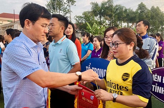 Phó Bí thư thường trực Tỉnh ủy Trần Văn Huyến trao cơ lưu niệm cho các đội tham gia hội thao