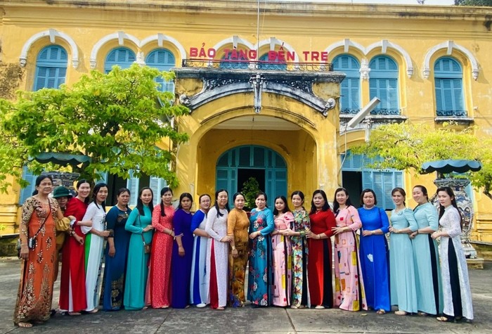Đoàn cán bộ, hội viên phụ nữ huyện Long Mỹ chụp ảnh lưu niệm chuyến hành quân về nguồn tại Bến Tre