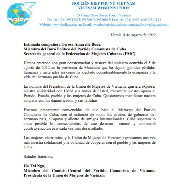 Chủ tịch Hội LHPN Việt Nam gửi điện chia buồn thăm hỏi người dân Cuba ảnh hưởng bởi thiên tai 15/08/2022 Cổng Thông tin điện tử Hội LHPN Việt Nam xin trân trọng gửi nội dung toàn văn bức Điện như sau: