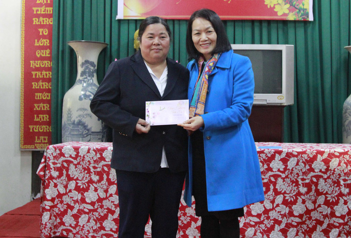 Phó Chủ tịch Hội LHPNVN Bùi Thị Hòa (phải) tặng quà cho đại diện Hội LHPN xã Dương Xá