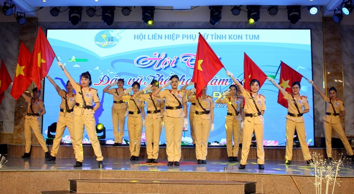 Trao cờ lưu niệm cho các đội thi. Ảnh: HT Tham gia Hội thi, 12 đội đã thể hiện 24 tiết mục qua 2 phần thi bắt buộc và tự chọn. Với tinh thần nhiệt huyết, đầu tư, chuẩn bị công phu, các đội thi đã mang đến các tiết mục sôi nổi, vui tươi trên nền nhạc các ca khúc ca ngợi quê hương, đất nước, gia đình, ca ngợi truyền thống tốt đẹp của phụ nữ Việt Nam.