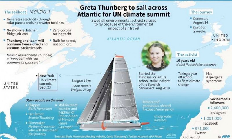 Ngày 29/8, cô gái trẻ Thụy Điển Greta Thunberg đã hoàn thành hành trình vượt Đại Tây Dương dài 15 ngày trên một du thuyền công nghệ cao, không khí thải và cập bến tại New York (Mỹ) để chuẩn bị tham dự hội nghị thượng đỉnh về khí hậu của Liên hợp quốc (LHQ) ngày 23/9 tới.