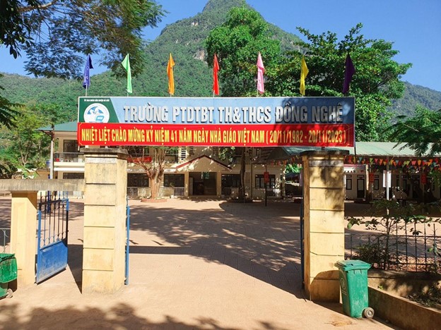 Cô Nguyễn Thị Nhiên (Hiệu trưởng Trường Phổ thông dân tộc bán trú Tiểu học và Trung học cơ sở Đồng Nghê) cho biết, nhà trường hiện có 38 cán bộ giáo viên, nhân viên và 258 học sinh, chủ yếu là dân tộc Tày, Mường, Dao. Trường được chia thành 3 điểm trường, trong đó xa nhất là điểm trường xóm Đăm (cách trung tâm xã 18km), điều kiện cơ sở vật chất còn hạn chế, giao thông vô cùng khó khăn, nhất là vào mùa mưa khiến đường trơn trượt, thường xuyên sạt lở rất khó đi lại.