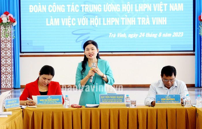 Phát biểu kết luận buổi làm việc, đồng chí Tôn Ngọc Hạnh đánh giá cao những hoạt động của Hội LHPN tỉnh Trà Vinh trong tập hợp hội viên, thực hiện các phong trào công tác Hội, sắp xếp tốt bộ máy, thực hiện tốt các chương trình an sinh xã hội, có nhiều hoạt động trao đổi, chia sẻ, tập huấn trong công tác, hỗ trợ khởi nghiệp...