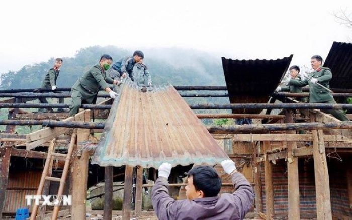 Cán bộ, chiến sỹ Công an phối hợp với người dân chung tay xóa nhà tạm, nhà dột nát. (Ảnh: Quý Trung/TTXVN)