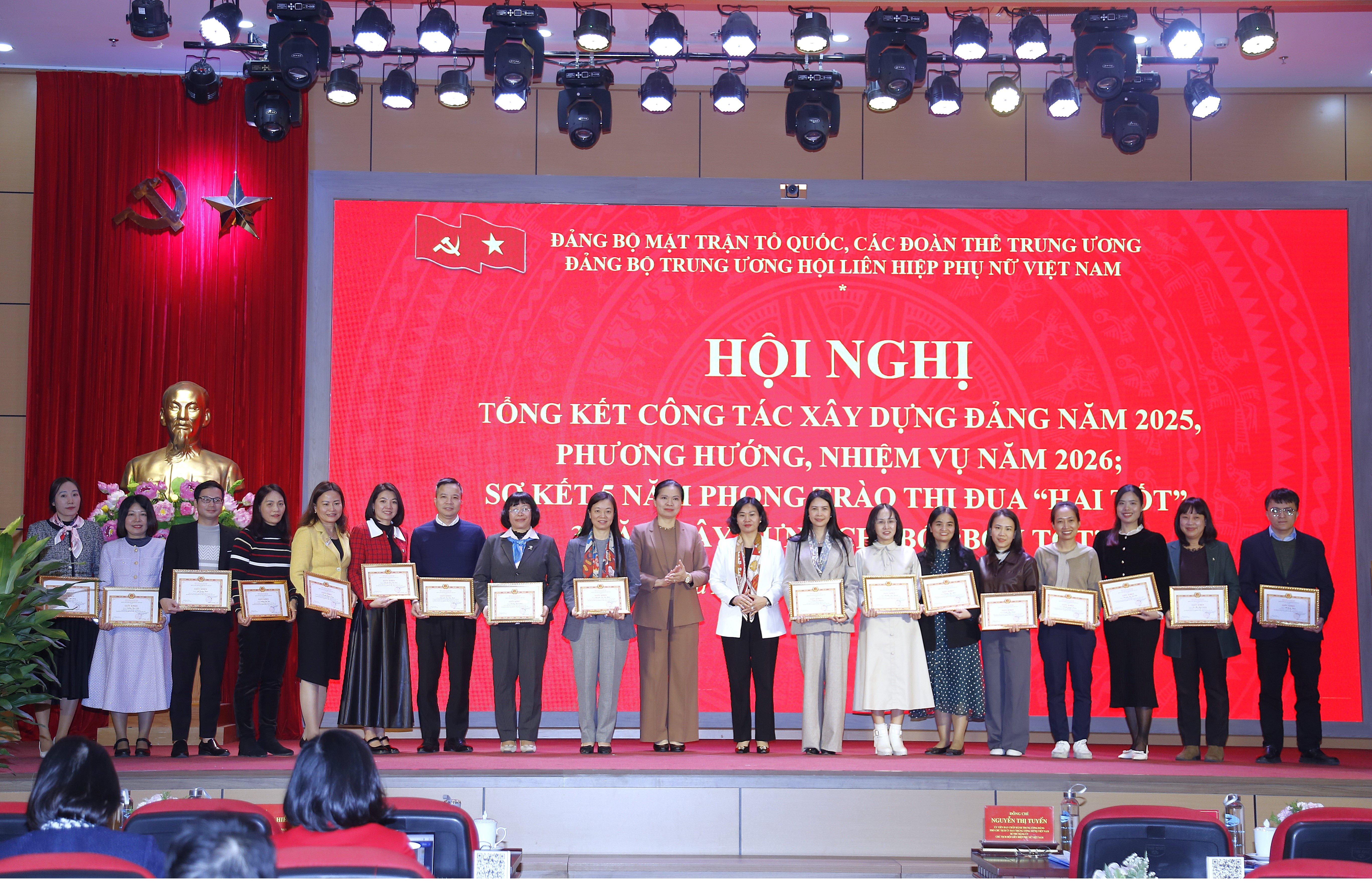 Đồng chí Hà Thị Nga (thứ 9 từ phải sang), Ủy viên BCH TW Đảng, Phó Bí thư Thường trực Đảng uỷ MTTQ, CĐTTW, Phó Chủ tịch UBTW MTTQ Việt Nam; đồng chí Nguyễn Thị Tuyến (thứ 10 từ trái sang), Ủy viên BCH TW Đảng, Ủy viên Ban Thường vụ Đảng ủy MTTQ, CĐTTW, Phó Chủ tịch UBTW MTTQ Việt Nam, Bí thư Đảng ủy TW Hội LHPN Việt Nam, Chủ tịch Hội LHPN Việt Nam trao Giấy khen cho các đảng viên đạt thành tích xuất sắc trong triển khai phong trào thi đua "Hai tốt" giai đoạn 2021-2025