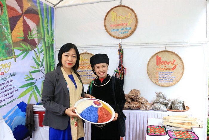 Từ huyện Định Hóa xuống trưng bày sản phẩm tại Hội chợ, chị Lý Thị Chiên, chủ Noọng homestay hào hứng giới thiệu đặc sản của đồng bào dân tộc Tày tới khách tham quan. Là một người tâm huyết với văn hóa và ẩm thực dân tộc, chị đã thành lập mô hình HTX Noọng Homestay với mong muốn bảo tồn văn hóa và giới thiệu đặc trưng trong phong tục tập quán và ẩm thực của người Tày đến với du khách. Những sản phẩm chị mang đến Hội chợ đều mang đặc trưng riêng của dân tộc Tày như xôi ngũ sắc, cơm lam, măng rừng,…Chị cho biết mục đích chính khi đến hội chợ là giao lưu, kết nối và quảng bá mô hình. Trong buổi sáng khai mạc hội chợ, đã có rất nhiều khách hàng quan tâm và xin số liên hệ của homestay. Với chị đó là cơ hội không dễ gì có được và là sự thành công vượt ngoài kỳ vọng.
