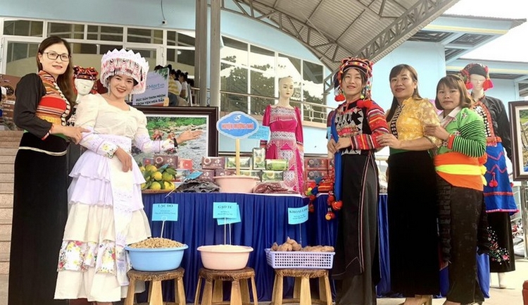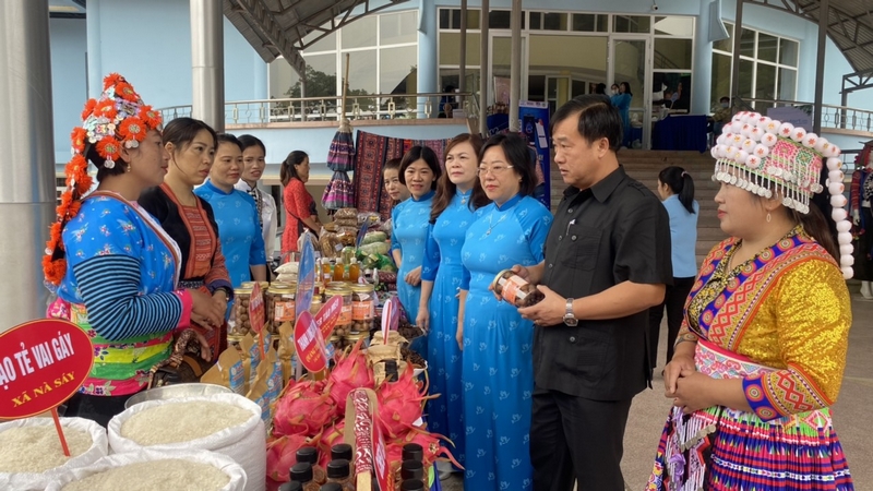 Phó chủ tịch UBND tỉnh Điện Biên Vừ A Bằng (thứ hai từ phải sang) thăm gian hàng trưng bày tại Ngày hội Phụ nữ khởi nghiệp 2022