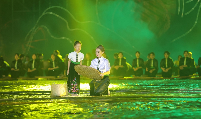 Trong khung cảnh đó ẩn hiện là hình tượng quả bầu tiên, ruộng lúa bậc thang chín vàng, những cây hoa ban trắng, nón của người Thái hay chiếc khăn Piêu cùng mô hình nhà sàn, núi non trùng điệp… Bối cảnh ấy đủ hùng vĩ, đủ thấy một đại ngàn Tây Bắc thu nhỏ để kể một câu chuyện sử thi đầy cảm xúc, mà bắt đầu là chương Thiên di – Dựng bản, lập mường, tái hiện cảnh 2 anh em Tạo Xuông & Tạo Ngần đã xuôi theo các dòng sông, con suối dựng bản, lập mường.
