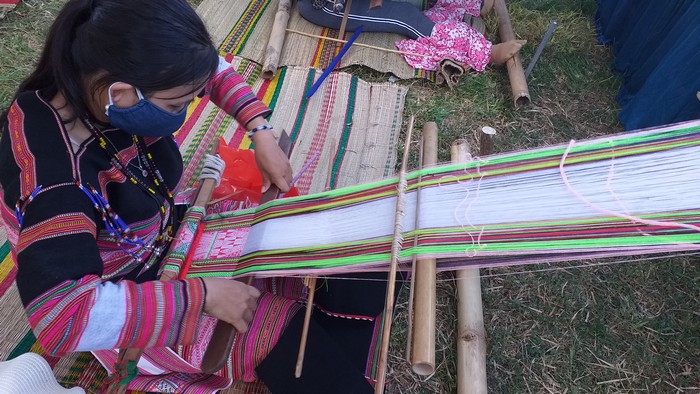 Phụ nữ Bana xã Vĩnh An thi dệt thổ cẩm tại Ngày hội VHTT các dân tộc thiểu số miền núi tỉnh lần thứ XVI - năm 2022 (Ảnh: N.ÁNH)