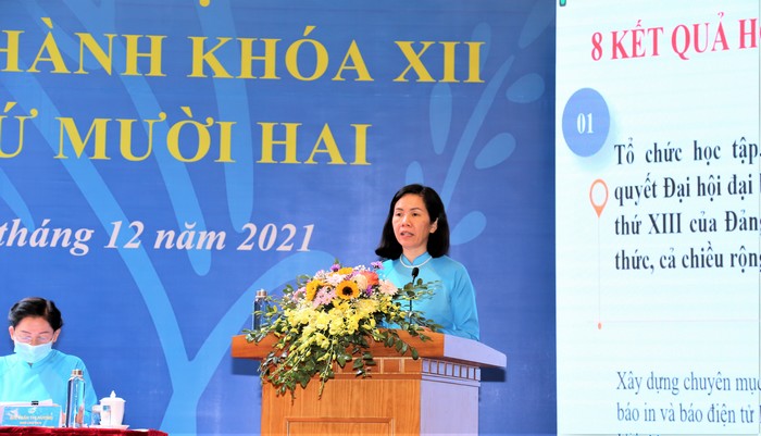 Phó Chủ tịch Hội LHPN Việt Nam Nguyễn Thị Minh Hương trình bày dự thảo Báo cáo Kết quả hoạt động năm 2021 tại Hội nghị Ban Chấp hành TW Hội LHPN Việt Nam khóa XII, lần thứ 12 Báo cáo kết quả hoạt động Hội năm 2021 tại Hội nghị Ban Chấp hành TW Hội LHPN Việt Nam khoá XII, lần thứ 12 đánh giá: