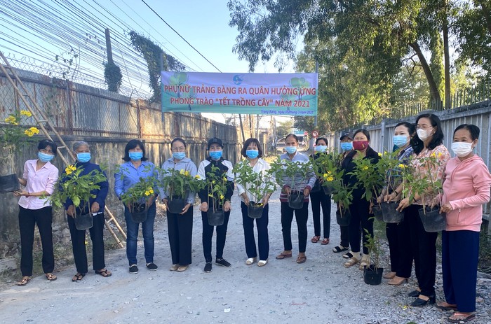 Hội viên, phụ nữ Hội LHPN thị xã Trảng Bàng (tỉnh Tây Ninh) tham gia đóng góp cây xanh ủng hộ phong trào Tết trồng cây năm 2021