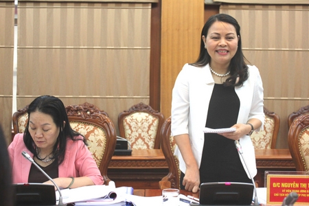 PCT Hội LHPNVN Bùi Thị Hòa phát biểu tại buổi làm việc với Quận ủy Bắc Từ Liêm (Hà Nội) |