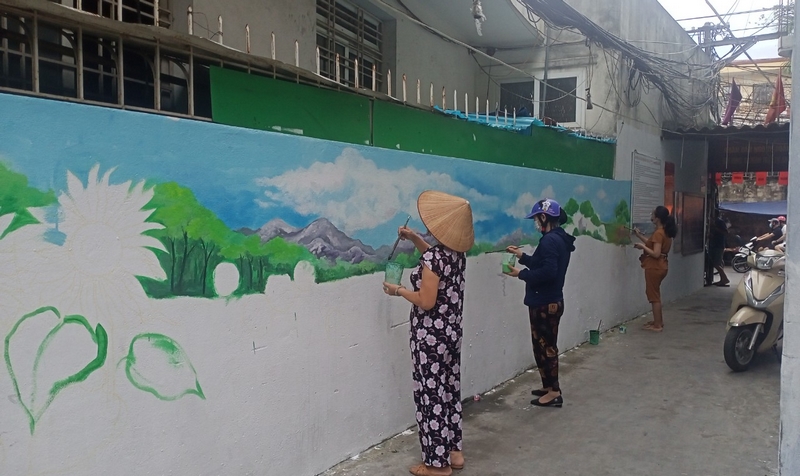 Cán bộ, hội viên, phụ nữ tham gia vẽ tranh - hoạt động của mô hình “Ngõ xóm xanh”