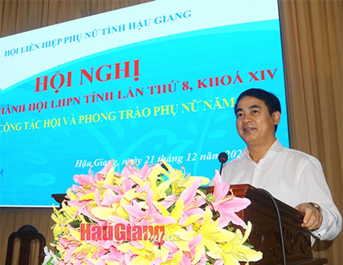 Ông Trần Văn Chính, Chủ tịch Ủy ban MTTQ Việt Nam tỉnh, trao cờ đơn vị dẫn đầu phong trào thi đua năm 2023 của Trung ương Hội LHPN Việt Nam cho Hội LHPN tỉnh Bí thư Tỉnh ủy nhấn mạnh: “Năm 2023, tỉnh ta đã đạt được nhiều kết quả ấn tượng, tỉnh tiếp tục dẫn đầu khu vực đồng bằng sông Cửu Long, vươn lên đứng thứ hai cả nước với tốc độ tăng trưởng (GRDP) năm 2023 ước đạt 12,27%. Tỉnh đã vận động xây dựng hơn 1.400 căn nhà “Đại đoàn kết”, tổ chức được nhiều sự kiện, lễ hội ý nghĩa mang tầm quốc gia, quốc tế, tạo được sự lan tỏa rộng rãi về đất, con người Hậu Giang vươn tầm phát triển mạnh mẽ. Những thành tựu tỉnh đạt được có sự đóng góp lớn của các cấp Hội phụ nữ toàn tỉnh”.