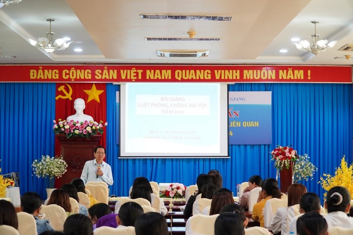 Đồng chí Cao Thanh Sơn, Giám đốc Sở Tư pháp trình bày chuyên đề “Pháp luật về phòng, chống tệ nạn ma túy và phòng, chống bạo lực học đường”