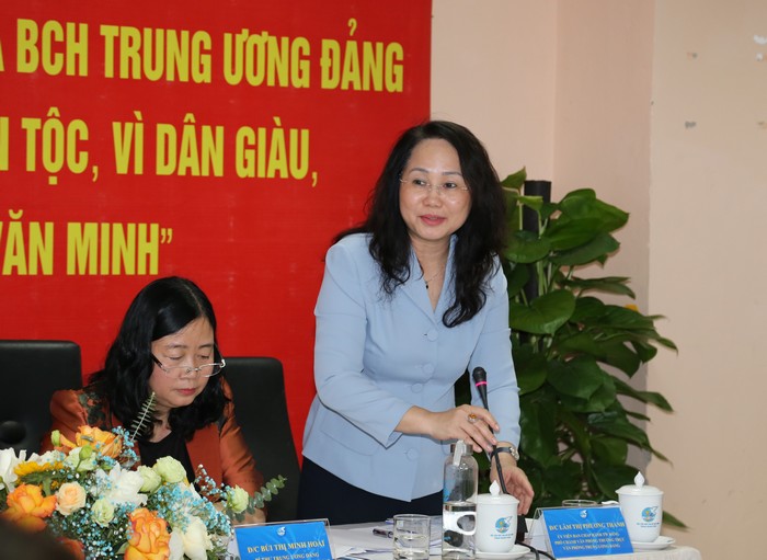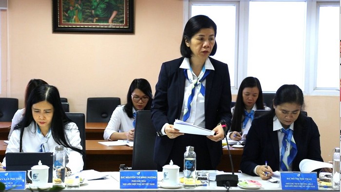 Phó Chủ tịch Hội LHPN Việt Nam Nguyễn Thị Minh Hương trình bày Báo cáo thực hiện Nghị quyết số 23-NQ/TW của Đảng đoàn Hội LHPN Việt Nam