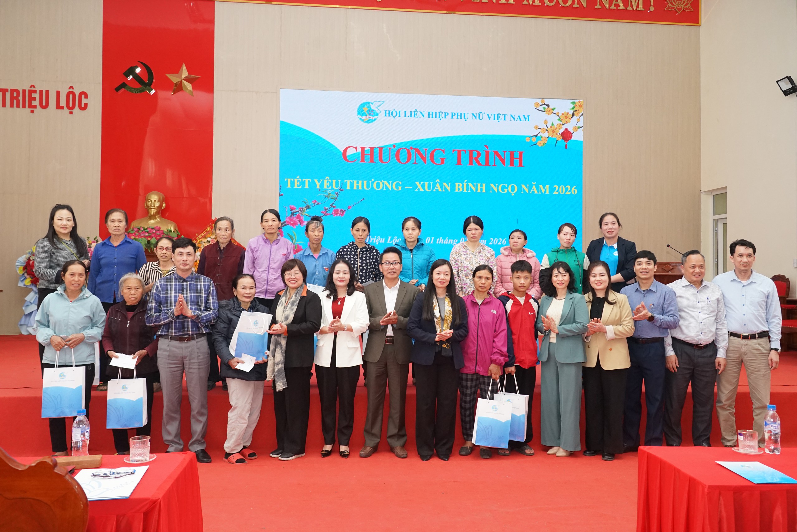 Đoàn công tác Hội LHPN Việt Nam chụp ảnh với lãnh đạo địa phương xã Triệu Lộc và những phụ nữ có hoàn cảnh khó khăn