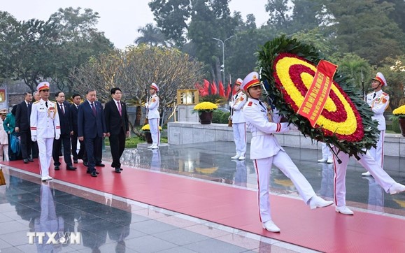 Đoàn đại biểu lãnh đạo Đảng, Nhà nước do Tổng Bí thư Tô Lâm dẫn đầu đến đặt vòng hoa tại Đài tưởng niệm các Anh hùng liệt sỹ trên đường Bắc Sơn (Ba Đình, Hà Nội). (Ảnh: TTXVN)