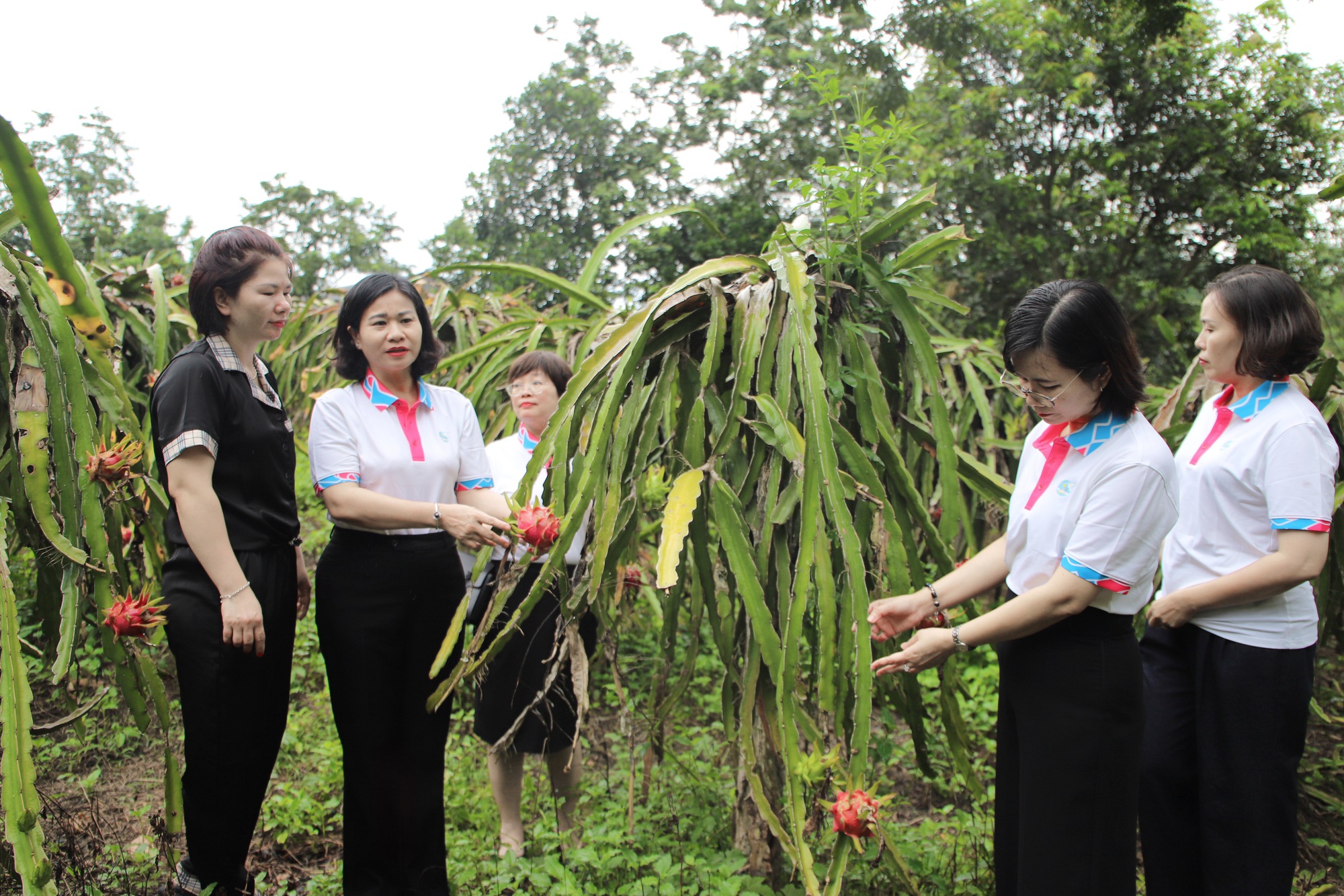 Ủy viên TƯ Đảng, Phó Chủ tịch UBTƯ MTTQ Việt Nam, Chủ tịch Hội LHPN Việt Nam Nguyễn Thị Tuyến (thứ 2 từ trái qua) thăm vườn thanh long của chị Hoàng Thị Lan Tại thôn Bòng, xã Tân Trào, tỉnh Tuyên Quang, Ủy viên TƯ Đảng, Phó Chủ tịch UBTƯ MTTQ Việt Nam, Chủ tịch Hội LHPN Việt Nam Nguyễn Thị Tuyến đến thăm mô hình vườn thanh long do chị Hoàng Thị Lan canh tác. Qua trao đổi, chị Hoàng Thị Lan cho biết sau nhiều năm đi làm công nhân ở miền Nam, chị nhận thấy giống cây thanh long từ vùng đất Bình Thuận cho năng suất tốt nên đã mạnh dạn mang giống về trồng thử nghiệm tại đất vườn nhà. Được Hội LHPN tỉnh hỗ trợ nguồn vốn tạo sinh kế cho phụ nữ dân tộc thiểu số, từ mô hình nhỏ chỉ vài sào, đến nay chị Lan đã nhân rộng mô hình với diện tích cây trồng lên đến hơn 1 ha, cho năng suất thu về khoảng 1 tấn thanh long/năm với hình thức bán buôn là chủ yếu.