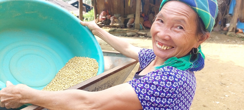 Niềm vui được mùa của bà con người Mông khi thu hoạch đậu tương.