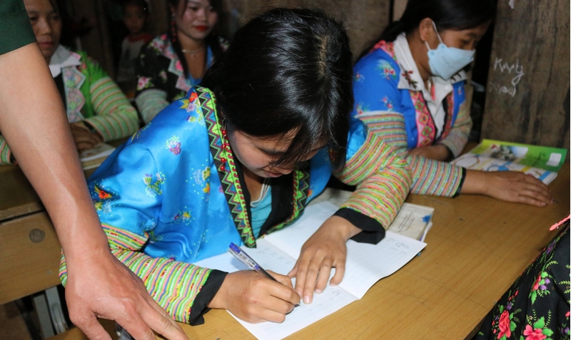 Thời điểm này, lớp học xóa mù chữ ở bản Pu Hao, xã Mường Lạn, huyện Sốp Cộp, tỉnh Sơn La, do Đồn Biên phòng Mường Lạn tổ chức vẫn sáng đèn mỗi đêm. Tất cả học viên của lớp đều là phụ nữ Mông ở các độ tuổi khác nhau. Khuôn mặt mỗi người đều ánh lên niềm vui tươi, hứng khởi. Họ chăm chú lắng nghe từng lời giảng của thầy giáo Biên phòng, dõi theo từng nét chữ của thầy giáo rồi chép lại vào vở.