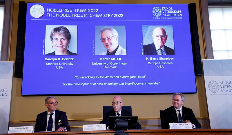Chiều 5/10, Viện Hàn lâm khoa học hoàng gia Thụy Điển đã công bố giải Nobel Hóa học năm 2022 thuộc về 3 nhà khoa học Carolyn R. Bertozzi (Mỹ), Morten Meldal (Đan Mạch) và K. Barry Sharpless (Mỹ) với nghiên cứu phản ứng hóa học click và phản ứng hóa học sinh trực giao, được sử dụng trong phát triển dược phẩm và lập bản đồ ADN.