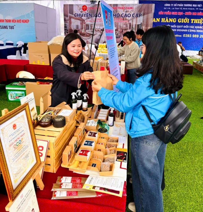 Chị Hoài với các sản phẩm Hương Hồng Hạc tại hội chợ trưng bày sản phẩm OCOP