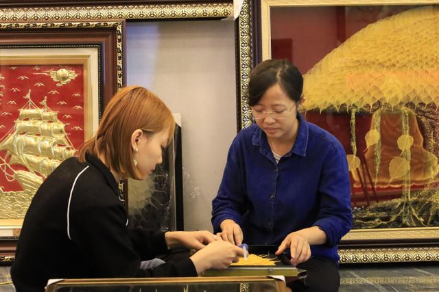 Chị Lý hướng dẫn cho khách thăm quan HTV về quy trình làm tranh lá Bồ đề