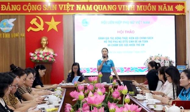 Bà Nguyễn Thị Thu Hiền - Phó Chủ tịch Hội LHPN Việt Nam - phát biểu tại hội thảo. Ảnh: Thanh Quỳnh Dự hội thảo có các đồng chí: Nguyễn Thị Thu Hiền - Phó Chủ tịch Hội LHPN Việt Nam; đại diện các ban TƯ Hội LHPN Việt Nam; Nguyễn Thị Quỳnh Hoa - Chủ tịch Hội LHPN tỉnh Nghệ An; đại diện Sở Y tế, Ban Dân tộc tỉnh, Trung tâm Kiểm soát bệnh tật tỉnh Nghệ An và các đơn vị liên quan.