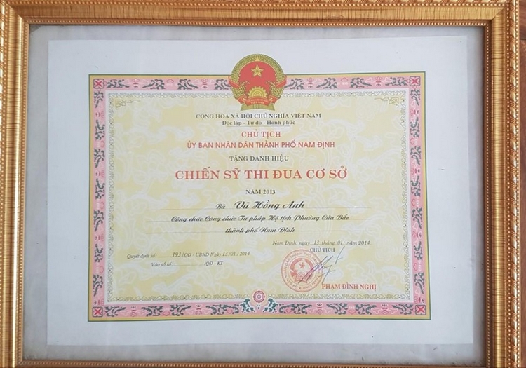 Bằng khen, giấy khen về thành tích của nữ cán bộ tư pháp Vũ Hồng Anh.