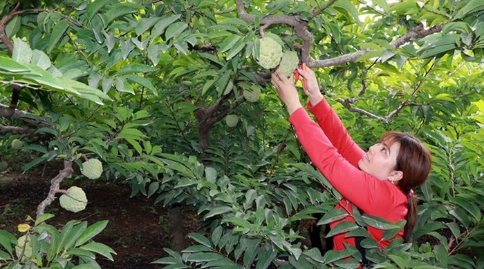 Chị Đỗ Thị Hoa thu hoạch quả na. Năm 2006, vợ chồng chị Hoa bắt đầu khởi nghiệp với việc nuôi 3 con lợn nái. Do vốn ban đầu còn ít nên chị chăn nuôi kiểu truyền thống, chuồng trại sơ sài. Nhờ cần cù chịu khó, năm 2009, đàn lợn tăng lên 12 con lợn nái. Khi tự sản xuất được lợn giống, anh chị mạnh dạn vay thêm vốn mở rộng chuồng trại. Trải qua không ít thăng trầm, giá lợn khi lên khi xuống, song vợ chồng chị Hoa vẫn cố gắng duy trì. Hiện, hệ thống chuồng trại của anh chị đã được xây dựng quy mô bài bản trên diện tích 400m2 với hơn 200 con lợn thịt.