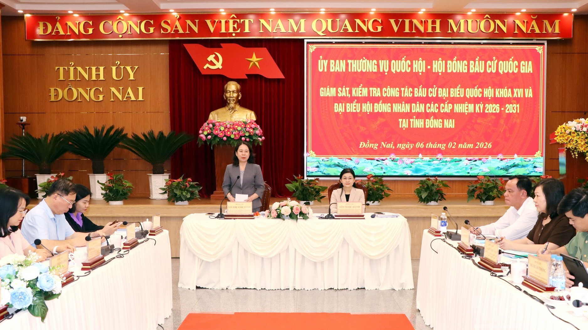 Phó Chủ tịch nước Võ Thị Ánh Xuân đề nghị Ban Thường vụ Tỉnh ủy và Ủy ban bầu cử tỉnh Đồng Nai cần tiếp tục xác định cuộc bầu cử đại biểu Quốc hội khóa XVI và đại biểu hội đồng nhân dân các cấp nhiệm kỳ 2026-2031 là nhiệm vụ chính trị trọng tâm, ưu tiên hàng đầu, tập trung tăng cường lãnh đạo, chỉ đạo triển khai chặt chẽ, đúng luật, đúng tiến độ các bước từ nay đến ngày bầu cử và sau bầu cử.