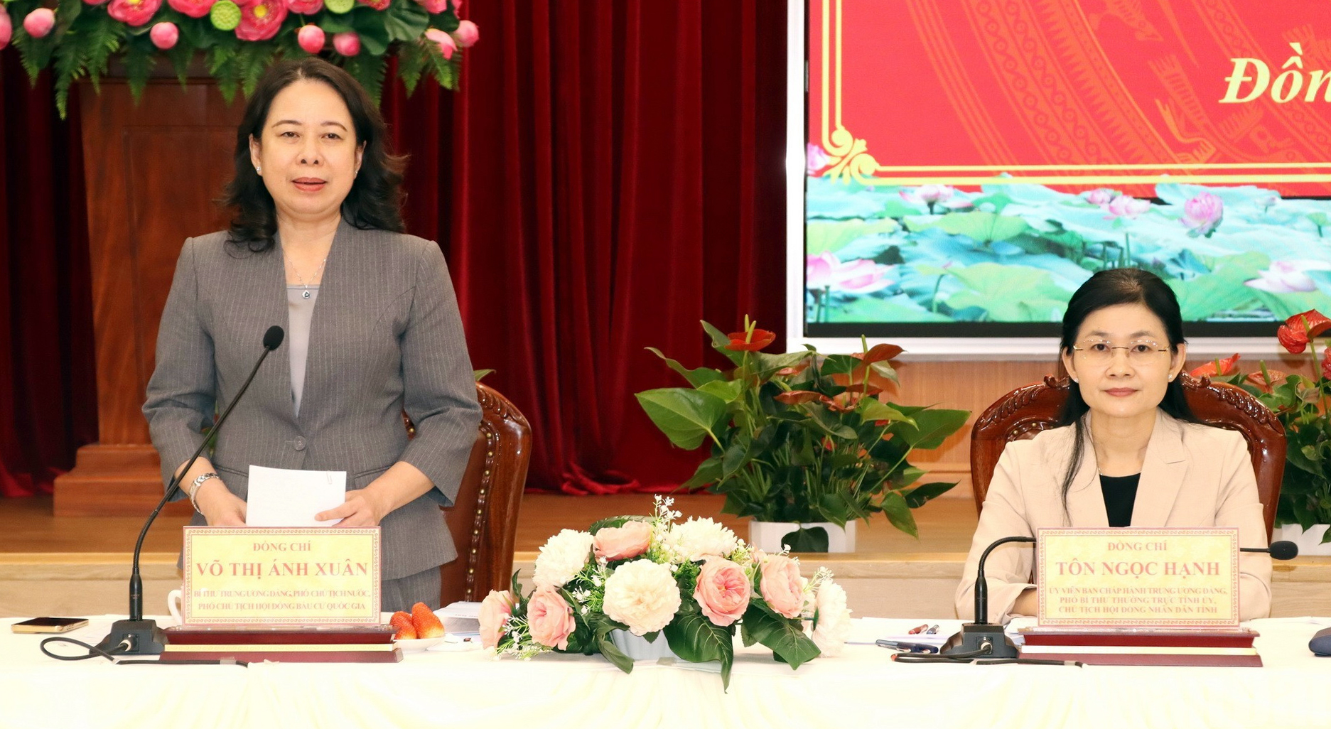 Bà Võ Thị Ánh Xuân (bên trái), Bí thư Trung ương Đảng, Phó Chủ tịch nước, Phó Chủ tịch Hội đồng bầu cử Quốc gia và bà Tôn Ngọc Hạnh, Ủy viên TƯ Đảng, Phó Bí thư Thường trực Tỉnh ủy, Chủ tịch HĐND tỉnh Đồng Nai, chủ trì buổi làm việc