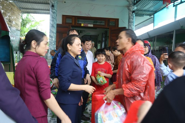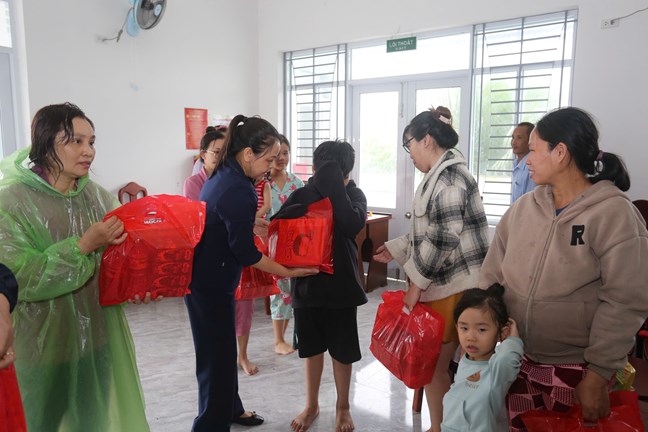 Phó Chủ tịch - Tổng Thư ký Nguyễn Thị Thu Hà tặng quà cho người dân vùng ngập lụt tại điểm tránh trú an toàn.