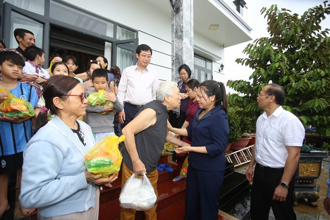 Phó Chủ tịch - Tổng Thư ký Nguyễn Thị Thu Hà tặng quà cho các hộ dân bị ngập lụt xã Diên Thọ