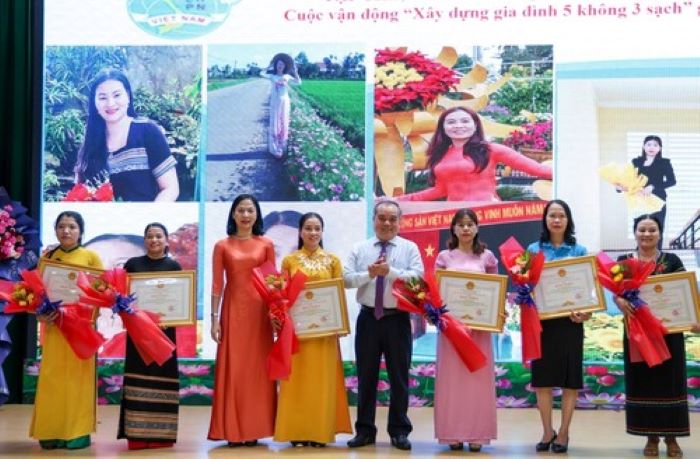 Tại Hội nghị, TW Hội LHPN Việt Nam đã trao tặng Bằng khen cho 7 cán bộ Hội chuyên trách có thành tích xuất sắc trong thực hiện nhiệm vụ công tác Hội và phong trào thi đua năm 2023; UBND tỉnh trao tặng Bằng khen cho 4 tập thể, 9 cá nhân có thành tích trong thực hiện Cuộc vận động “Xây dựng gia đình 5 không, 3 sạch” giai đoạn 2021 – 2024.
