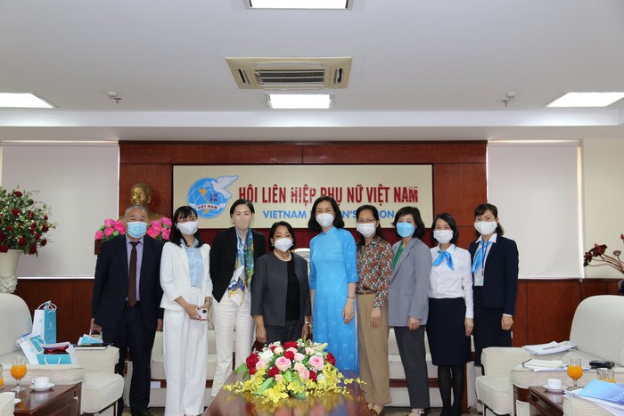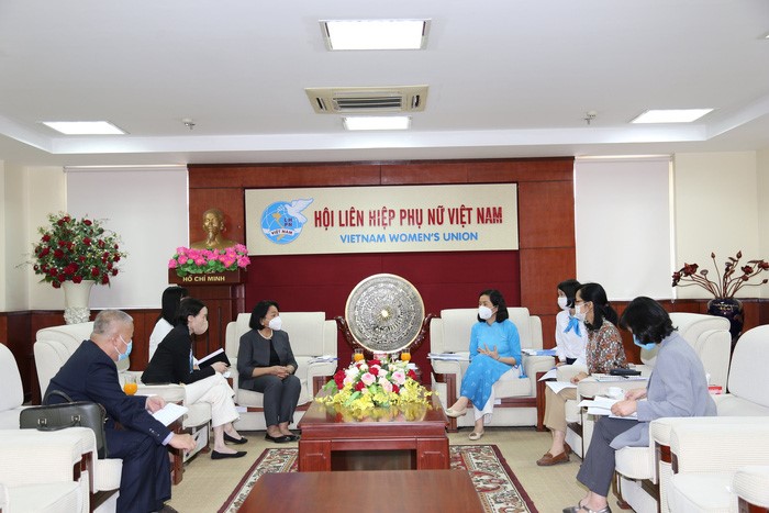 Phó Chủ tịch Hội LHPN Việt Nguyễn Thị Minh Hương (bìa phải) tiếp bà Nenette Motus, Giám đốc IOM khu vực Châu Á-Thái Bình Dương. Chiều ngày 19/4/2022, tại Hà Nội, đại diện lãnh đạo Hội LHPN Việt Nam và Tổ chức Di cư Quốc tế đã có buổi gặp mặt và trao đổi về các hoạt động phối hợp giữa hai bên trong giai đoạn 2 của Dự án hỗ trợ tái hòa nhập bền vững cho phụ nữ di cư hồi hương.