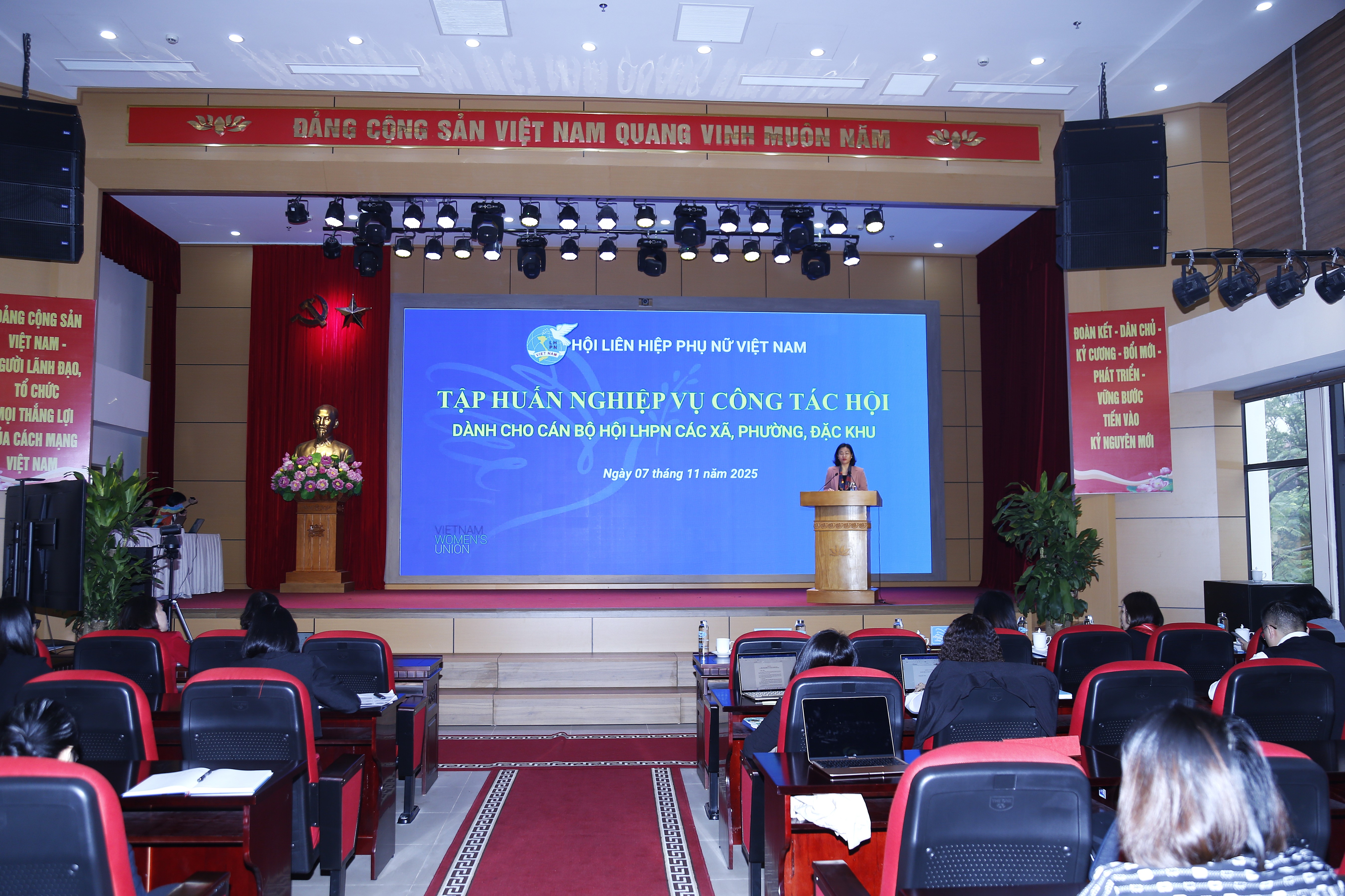 Phát biểu khai mạc lớp tập huấn, Ủy viên BCH TW Đảng, Phó Chủ tịch Uỷ ban TW MTTQ Việt Nam, Chủ tịch Hội LHPN Việt Nam Nguyễn Thị Tuyến cho biết trong bối cảnh toàn quốc đang gấp rút hoàn thành công tác chuẩn bị cho Đại hội toàn quốc lần thứ XIV của Đảng và tập trung chỉ đạo Đại hội đại biểu phụ nữ các cấp nhiệm kỳ 2025 - 2030, TW Hội LHPN Việt Nam quyết định tổ chức lớp tập huấn nghiệp vụ quan trọng nhằm củng cố và nâng cao năng lực cho đội ngũ cán bộ Hội cấp xã, phường và đặc khu, đặc biệt là cán bộ mới, tập trung triển khai chương trình hành động và nhiệm vụ trong nhiệm kỳ mới.
